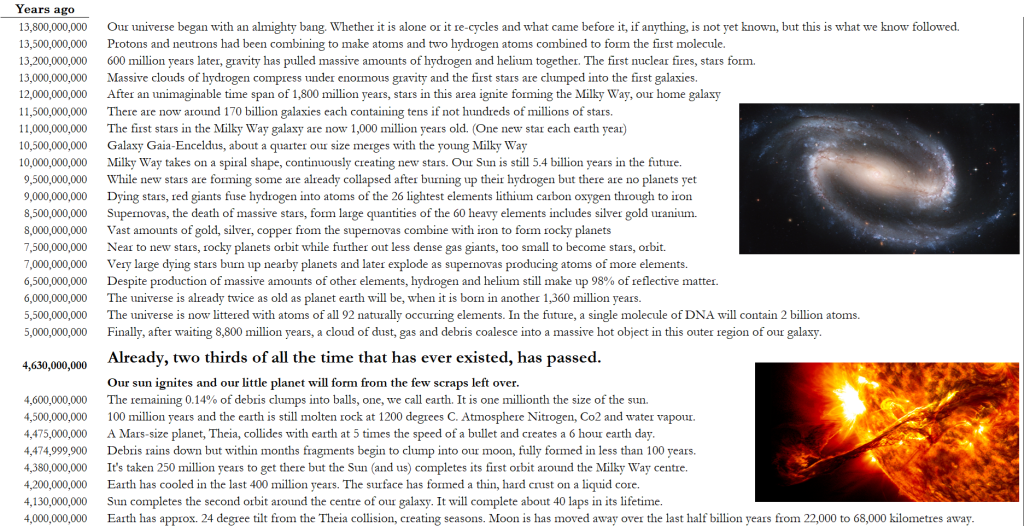 The poster is way too big to show an image that has legible entries on even the largest screen. Instead, here is one small part to provide a sense of the entries. The time gaps in this first part are much larger than later entries as not a lot was happening in the Universe for the first few billion years. It gets way more interesting once life gets going.